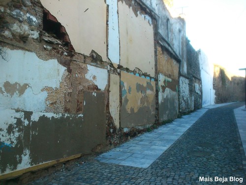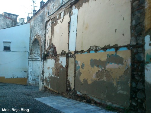 Mas ao passear pelo bairro, deparei-me com algo absolutamente horrível, mais precisamente na Rua da Muralha, junto às Portas de Moura. Nesta rua encontra-se parte da muralha do castelo. Sim, o castelo de Beja tinha uma extensa muralha, que parte foi destruída e outra parte foi tapada com a construção de casas. Ora, nesta rua, colada à muralha que vem do castelo, existiam casas, que foram deitadas a baixo e, até aqui, tudo certo. O problema é que as paredes que estavam coladas/fixas à muralha permaneceram de pé. Ou seja, apesar de as casas terem vindo abaixo, as paredes continuam a tapar a muralha. Ora vejam as fotos: