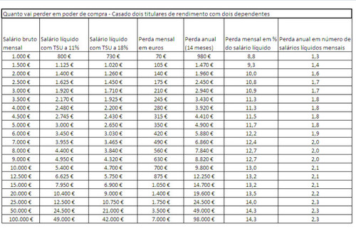 O salário mínimo vai baixar em Portugal pela primeira vez desde que foi criado. Esta é uma consequência directa do aumento da taxa social única (TSU) em sete pontos percentuais, que se aplica a todos os trabalhadores de forma indiferenciada. (...) Actualmente, o salário líquido bruto é de 485 euros. Líquido, deduzido da taxa social única de 11%, é de 431,65 euros. Passando esta taxa para os 18%, o salário mínimo líquido passa para 397,7 euros."
