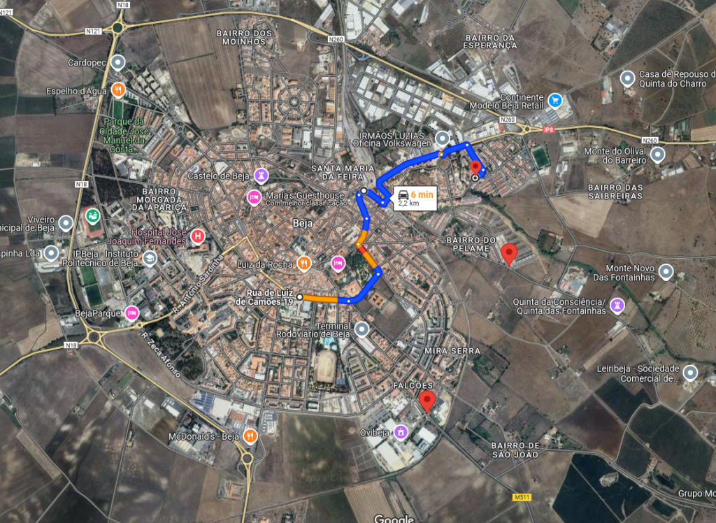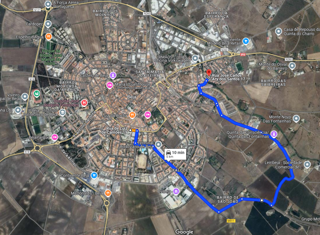 Tomemos como exemplo, ir da Escola Secundária Diogo Gouveia (Liceu) para o Bairro da Conceição, por dentro da cidade. Nesta opção, o automobilista percorre uma distância de 2.3 km: