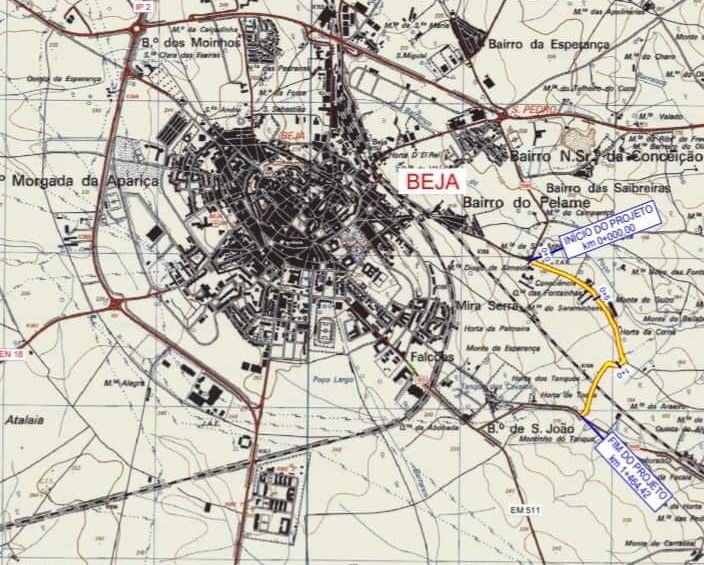 A Câmara Municipal de Beja anunciou o lançamento de um concurso para pavimentação de uma estrada rural (Estrada do Sacramento), com o objetivo de criar uma alternativa de acesso rodoviário à zona do Bairro da Conceição, Bairro do Pelame, Quinta Del Rey, parque industrial e Beja Retail Park, num investimento de 220.000,00€ + IVA. Esta estrada, para quem não sabe, já existe. É um caminho agrícola, em terra e pedras, de acesso a olivais e montes, e liga a estrada do Alcoforado (que dá acesso Vila Azedo) e o parque operacional da EMAS. Deixo aqui o mapa disponibilizado pelo presidente da autarquia (ver linha a amarelo):