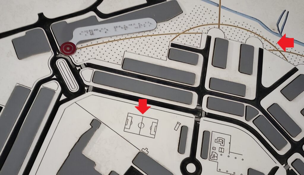 Não existe qualquer caminho acessível (como assinalado a dourado no mapa na seta vermelha à direita), nem campo de futebol (como aparece na imagem do mapa na seta vermelha inferior). Na área marcada, o que realmente existe é pasto e hortas clandestinas.